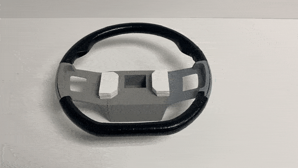 The steering wheel is constructed from 3D-printed segments, which are epoxied together and wrapped with black tape. The center hole is designed to accommodate a standard diameter steering column shaft, with the wheel being a full 1:1 scale replica of a production steering wheel. The center also features a cutout designed to house a programmable deck, which serves as the second major component of the system.